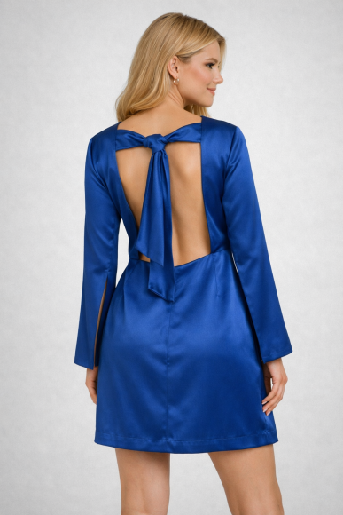 Vestido de festa curto, mangas longas com fendas, em cetim cor azul royal, com faixas de amarrar nas costas, costas à mostra, zíper invisível na saia atrás.